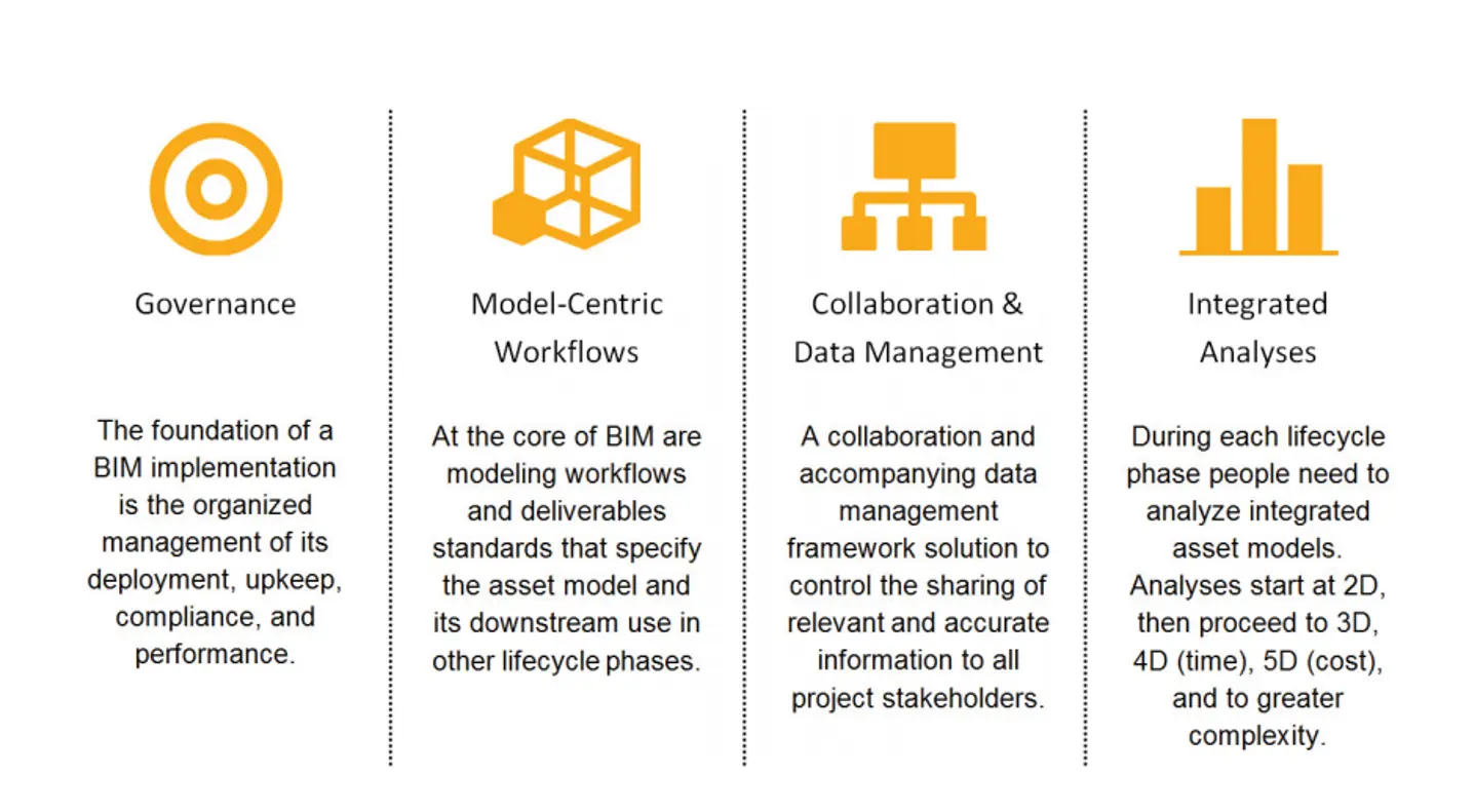 Successful BIM implementation at the project-level requires organizational-level strategic planning that considers issues of technical support in terms of hardware and software rationalization for cost-effective use. Organizations that stay focused on a logical order of change prioritization are more successful in achieving the benefits targeted in implementation planning efforts. The order of priority when increasing the maturity of a BIM implementation is shown in figure 2—increasing BIM maturity starts on the left and continues to the right with collaborative and analytical capabilities built on the foundation of solid governance and modeling. While this prioritization is clear, that is not to say that these four categories are implemented sequentially; they are integrated areas of improvement, each area incrementally benefitting and alimenting the improvement of the other (Autodesk,2012)