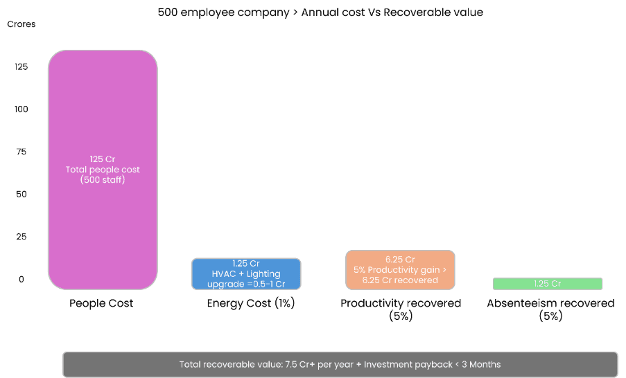 A conservative 5% improvement in effective productivity achievable through evidence-based workplace health strategies represents ₹6.25 crore in recovered value. A 5% reduction in absenteeism at the same company is roughly 1,250 person-days recovered per year. At ₹10,000 per person per day loaded cost, that's another ₹1.25 crore.
