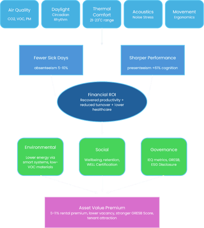 On the Social side, healthy buildings represent the most direct and measurable expression of an organization's commitment to human capital. Employee wellbeing is now explicitly included in major ESG frameworks including GRI, SASB, and TCFD-aligned reporting. When a company can demonstrate that its workspace reduces illness rates, improves cognitive performance, and supports mental health and can back that with building performance data it transforms "employee wellbeing" from a vague pledge in an annual report into a quantified, auditable asset.
