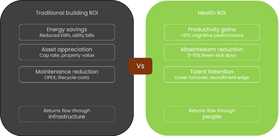 When you invest in better indoor air quality, optimized daylight, or acoustic comfort, the payoff isn't in your utility bill it's in fewer sick days, sharper thinking, better retention, and a workforce that actually shows up ready to work. The financial mechanism is indirect, but the scale is not. Research from the World Green Building Council consistently shows that a 1% improvement in employee productivity can offset an entire year's energy costs. Health ROI is where the real money lives.