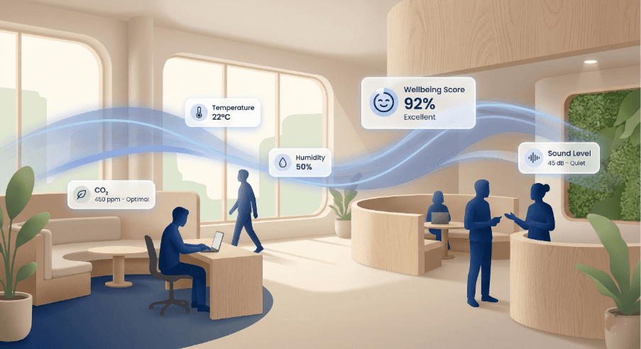Continuous environmental monitoring air quality, temperature, humidity, acoustic levels will become standard infrastructure, not an add-on. Wearable integration will allow organizations to correlate building conditions with health outcomes at a scale that produces statistically robust insights. Occupant wellbeing surveys will be replaced by real-time feedback mechanisms that allow building operators to respond to comfort issues within hours rather than lease cycles.