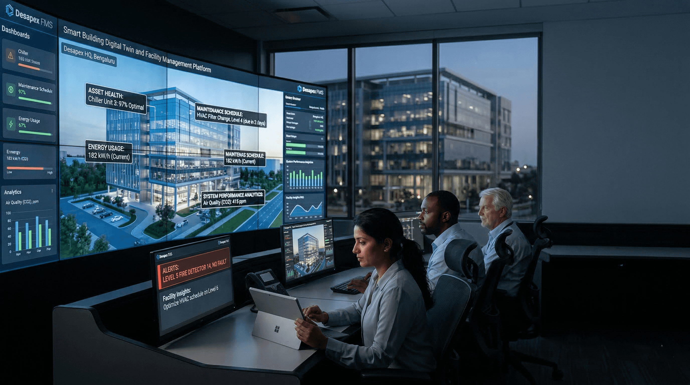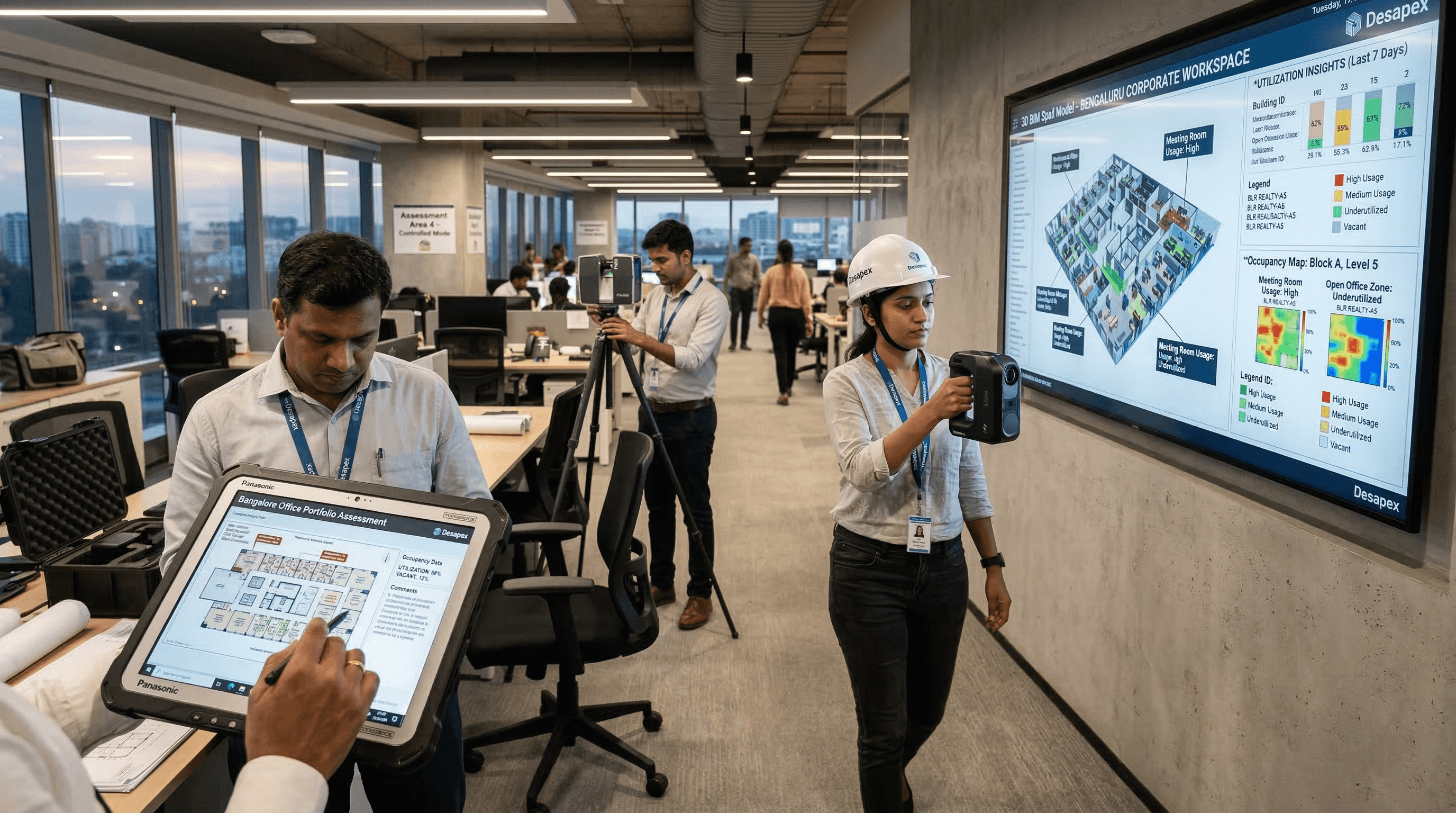 Desapex delivers digital engineering solutions for corporate real estate portfolios by combining scan-to-BIM modeling, workplace design coordination, digital project delivery, and smart building digital twin platforms. Corporate office environments are evolving rapidly with hybrid work models, sustainability requirements, and technology-driven workplaces. Desapex enables organizations to plan, design, and operate office spaces with greater efficiency and transparency by integrating BIM coordination, construction monitoring, and operational facility intelligence. Our digital-first workflows help corporate clients optimize space utilization, improve construction outcomes, and support long-term building performance across campuses and multi-site portfolios.
